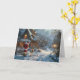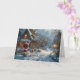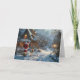 Esta imagen representa una escena de invierno serena y encantadora, perfecta para una tarjeta de felicitación para Navidades. Cuenta con una encantadora casita de campo cubierta de nieve, decorada con coloridas lámparas Navidades y decoraciones. El cálido resplandor de los ventanales de la cabaña crea un ambiente acogedor y acogedor. En primer plano, se ve a Santa Claus de pie con un bastón para caminar, caminando suavemente por un reno con unas cuerdas impresionantes. El reno tiene una marca en forma de corazón en la parte trasera, lo que le da un toque de capricho y amor al lugar. El camino de nieve que conduce a la cabaña está iluminado por un farol festivo, lo que aumenta aún más el ambiente mágico. La escena entera está envuelta en una suave nevada, creando un ambiente pacífico y festivo, ideal para difundir alegría y calor de las vacaciones.