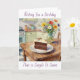 A birthday card with vintage vibes. A rustic wood kitchen table with a plate with birthday cake and vase of flowers in a mid century kitchen.