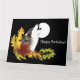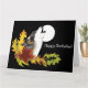 Un lobo aullando en una luna llena con hojas y bellotas de otoño con un fondo de negro