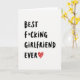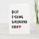 This greeting card keeps things simple and direct, with a white background and strong black lettering that grabs your attention right away. The main text reads “BEST f*CKING GIRLFRIEND EVER,” written in chunky, hand-drawn script and stacked vertically down the card. The letters look like they were drawn with a thick marker, giving it a personal, straight-from-the-heart feel. At the bottom, a bright red heart takes the place of a period, and it’s filled with small white flower details that add a softer touch. There aren’t any characters or extra objects—just the message, the heart, and lots of open space that makes everything easy to read. The asterisk in the swear word adds a funny, slightly cheeky edge while still keeping the focus on affection and appreciation. It feels perfect for a couple who likes to laugh and keep romance honest ❤️💌🍫.