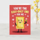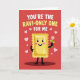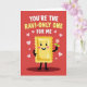 This cute card features a smiling ravioli character in a warm golden-yellow color with crimped edges and rosy cheeks. It has wide, happy eyes and holds out a small pink flower with a bright green stem, like a sweet little offering. The background is a deep red that sets a romantic mood, with light pink hearts floating all around. Across the top and center, the card says “YOU’RE THE RAVI-ONLY ONE FOR ME.” The text is in chunky block letters, mostly white with some yellow mixed in, and it stands out clearly against the red. A small shadow under the ravioli helps it feel grounded on the page, while the rest of the design stays simple and flat. It’s a fun, affectionate way to say “you’re my favorite” ❤️