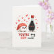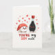 This greeting card shows a cute nigiri sushi and a smiling soy sauce bottle as friendly characters on a soft cream background. The sushi is white with a red piece of fish on top, and it has big bright eyes and pink cheeks. Next to it, the soy sauce bottle is dark black with a red cap, and it has the same happy face, looking like it’s hanging out with its best match. Small red hearts float around them, making the whole scene feel romantic and sweet ❤️. Near the bottom, the card says “YOU’RE my SOY mate,” with “YOU’RE” and “SOY mate” in clear block letters, and “my” smaller in the middle. The simple colors—white rice, black bottle, and red accents—make the characters and hearts stand out right away 💌🍫. Hope this helps you share your Valentine’s Day feelings with someone special in a kind, easy way.