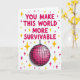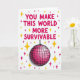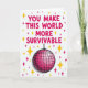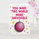 This card has a white background with a big message at the top that reads “YOU MAKE THIS WORLD MORE SURVIVABLE.” The words are in rounded, thick magenta letters, and they take up most of the upper part of the card so you notice them right away. Under the text sits a pink disco ball with a black grid of lines across it, like shiny tiles, and it has a soft gray shadow beneath to help it stand out. Around the disco ball, there are small bursts shaped like stars in yellow and magenta, scattered like little sparks in the air. The disco ball feels like it’s quietly glowing, and the star shapes make the whole scene feel upbeat without being loud. It’s a meaningful card to give when you want someone to know they matter to you and that their presence makes hard days easier 🥰. The message feels honest and supportive, whether it’s for a partner, a close friend, or someone you’re growing closer to ❤️. Hope it helps you share your Valentine’s Day feelings in a simple, caring way.