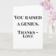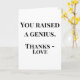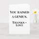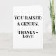 Featuring the phrase "You raised a genius. Thanks - Love" in a clean, contemporary typography, this card is a thoughtful way to thank dad and give credit where its due. Witty without being over the top, it's perfect for dads with a good sense of humour.