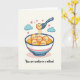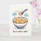 This Valentine’s Day card features a bowl of wonton soup filled with charming character details. Inside the bowl are six smiling wontons with rosy cheeks and soft wavy edges. Five float happily in a warm golden broth with thin noodles, while one wonton is lifted by a light blue spoon, drawing attention to its joyful expression. Pink hearts rise above the bowl, joined by two small blue clouds that add a gentle, dreamy accent. The background is a warm off-white that highlights the soft pastel colors. Below the illustration, bold lettering reads, “You are wonton in a million!” making this card a sweet and thoughtful way to share love 💌✨.