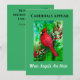 Encuentre inspiración con esta significativa tarjeta de cardenal. El mensaje esperanzador, "Los cardenales aparecen cuando los ángeles están cerca", es un versículo basado en la fe y reconfortante. Los observadores de aves se deleitarán con el diseño de pintura de acuarela que muestra colores vibrantes de rojo y verde bosque. "Estén quietos y sepan que yo soy Dios" es la cita bíblica en el reverso de la tarjeta.