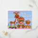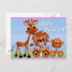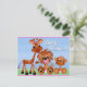 Saludo con ducha de bebé y tarjetas de invitación con un diseño azul y rosa con animales del zoo incluyendo un mono, león y jirafa.
