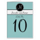 Tarjetas elegantes simples del número de la tabla de la recepción nupcial del monograma con el fondo azul claro, la inicial blanca del monograma en una etiqueta negra del círculo y nombres de novia y del novio en una raya blanco y negro. El personalizar con su número de la tabla del boda, inicial del monograma, nombres y colores del boda usando el menú fácil de utilizar de Zazzle incita. Este diseño simple con todo elegante de la inicial del monograma trabaja para todas las letras del alfabeto y es completamente adaptable adaptarse a cualquier combinación de color. Para pedir tarjetas múltiples, cambie el número y añada uno a su carro. Entonces cambie el número otra vez y añada a su carro. De modo que usted tenga el mismo número de órdenes de una tarjeta como usted necesita números de la tabla. Diseño de la disposición por el © de Elke Clarke.