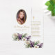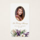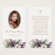 Elegantes tarjetas de oraciones/funerales con fotos florales doradas con flores moradas, orquídeas blancas y vegetación.
