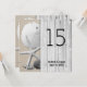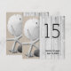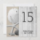 Tarjetas de número de mesa para boda en la playa cuadradas e impresas por ambos lados. Los números, nombres y fecha de la boda están impresos en negro en ambos lados, sobre una imagen de madera gris (paseo marítimo) con estrellas de mar, dólares de arena y conchas marinas en la arena.