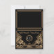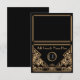Una tarjeta de lugar de boda o tarjeta de acompañante audaz y elegante, de estilo vintage con un tema "El Gran Gatsby" de los años veinte rugientes en tonos negros y dorados. Un fondo negro resalta el intrincado borde geométrico de estilo Art Deco en tonos beige dorados. Se han seleccionado fuentes decorativas de estilo de época para el nombre de su invitado y los monogramas de la novia y el novio se pueden agregar en un color gris plateado contrastante. Dobla cada tarjeta por la mitad para crear tarjetas de lugar de mesa plegables en forma de tienda.
