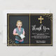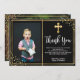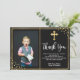 Tarjetas de agradecimiento sencillas y elegantes de oro y negro para bautizos. Envía agradecimientos a familiares y amigos con esta tarjeta plana religiosa personalizada moderna. Cuenta con una escritura a mano de "Gracias", un marco doble de falso oro y confeti dorado sobre fondo negro. Esta hermosa tarjeta de agradecimiento con foto moderna también será perfecta para tarjetas de agradecimiento de bautizo, ceremonia de nombre, confirmación y primera comunión para niño o niña. #3354