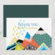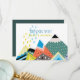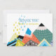Artículo de evento para bebé de estilo arte popular escandinavo moderno y extravagante con tonos vibrantes de azul pálido, amarillo y naranja. Muchas líneas angulares características de esta forma de arte popular y tendencia reciente. Con las montañas coronadas de nieve, este artículo es perfecto para tu baby shower de invierno.
