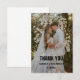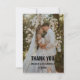 La imagen parece ser una tarjeta de agradecimiento de boda. Cuenta con una foto romántica de una pareja recién casada contra un fondo de flores en flor. El texto "GRACIAS" se muestra de manera destacada, junto con los nombres de la pareja y la fecha de la boda.