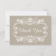 ¡Felicidades por tu próxima boda! Sé que es una experiencia emocionante y única que requiere meses de planificación y me encantaría ayudarte. Estas tarjetas de agradecimiento tienen un diseño simple pero elegante. Trabajo de volutas blancas sobre un fondo rico en color taupe. Mantén la redacción tal como está o personalízala con tu propio mensaje.