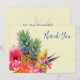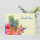 Notas de agradecimiento de flores tropicales y piña. Tarjetas planas de color amarillo pálido con flores hawaianas en la parte frontal. Las flores de hibisco, plumeria / frangipani y ave del paraíso son parte del diseño con dos piñas en el centro de las flores. Las plantillas de texto de color azul oscuro en la parte frontal y trasera son fáciles de personalizar según sea necesario. Incluya un mensaje y firma en la parte trasera sobre un fondo floral de ave del paraíso.