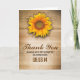 tarjeta de agradecimiento de boda con flor de girasol y fondo de madera rústica.