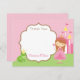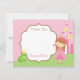 tarjeta de agradecimiento de princesa con fondo de lunares rosados, con el príncipe rana, castillo y princesa morena / pelo rojo.