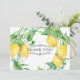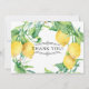 NOTAS DE AGRADECIMIENTO CON JUEGO COMPLETO DE PRODUCTOS. Tarjeta plana de 5x7 pulgadas, diseño horizontal para un diseño moderno y costo reducido, especialmente si las pide cuando ordene sus invitaciones ya que contarán para su descuento por cantidad. Este arreglo de limón con flores y frutas, Suite de Invitación de Boda Floral de Cítricos fue creado a partir de arte original pintado a mano, acuarela de Audrey Jeanne Roberts. El reverso tiene un patrón de rayas anchas pintado a mano de color amarillo limón pálido. Bonito. Fresco. De moda y sin embargo atemporal. Arte protegido por derechos de autor de Audrey Jeanne Roberts, todos los derechos reservados.
