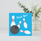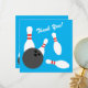 Agregue su propio texto personalizado para niño o niña. Color de fondo azul o personalizado. Diseño de bolos y bola de strike.