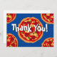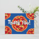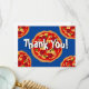 Tarjetas de agradecimiento para fiesta de cumpleaños con pizza con ingredientes. Personaliza con tu propio nombre y texto. Diseño divertido para niños. Ilustración grande de pizza redonda con pepperoni, aceitunas, tomate, queso y champiñones. Diseño de comida italiana para amantes de la pizza.