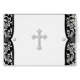 Elegante cruz de perla blanca y bautismo damasco negro y cartas de agradecimiento con encanto. Puede agregar el texto que necesita al frente y al interior en el estilo de fuente y color que desee, y puede mover y cambiar el tamaño de la cruz de perlas.