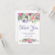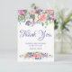 Hermosa manera de decir gracias por los regalos de boda. Hermosas flores rosadas y moradas rodeadas por una variedad de follaje en los bordes superior e inferior. Gracias está escrito en una fuente de escritura fluida y hermosa. Sus nombres y fecha de boda siguen en un texto moderno simple. Esto es parte de la colección Promise of Spring Wedding Suite. Debería poder ver productos coordinados y un enlace a ellos. Si no ve estos, por favor copie el siguiente enlace y péguelo en su navegador: https://www.zazzle.com/collections/promise_of_spring_wedding_suite-119632933934202901