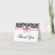 Tarjeta de agradecimiento elegante de damasco rosa y negro con fondo de damasco negro y lazo rosa con centro de diamante. Esta tarjeta de agradecimiento de damasco rosa y negro se puede personalizar fácilmente cambiando el color de fondo y el estilo de letra, tamaño y color. Personalice simplemente eligiendo el botón naranja "¡Personalízalo!" para comenzar a agregar los detalles de su evento, estilo de letra, tamaño y color de letra, y redacción. Tenga en cuenta que todos los diseños de tarjetas e invitaciones que encontrará en Zazzle son gráficos impresos sin joyas reales, lazos, partes o piezas en relieve, estampadas o añadidas.