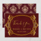 Espero que disfrutes de esta acuarela de vino de borgoña con una tipografía de marco dorado con un damasco en la parte trasera de la invitación a la carta.