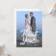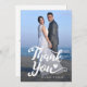 El caprichoso guión escrito a mano "Gracias" sobrepuesto sobre tu foto boda. Coincide con el guión "Guardar la fecha" y "Guardar nuestra fecha" con los corazones. Personalice añadiendo sus detalles, mensaje de agradecimiento, foto vertical delantera. Usa un mensaje de ejemplo o escribe tu propio mensaje. Esta original y elegante tarjeta de agradecimiento es perfecta para bodas, graduaciones y eventos similares.