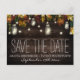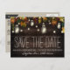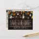 Tarjetas de boda de frasco de mason de luciérnaga de otoño para guardar la fecha: cuentan con un fondo de madera de granero rústico con hojas de arce, roble y otras en colores de otoño: rojo, burdeos, amarillo, verde y naranja con luces brillantes que se entrelazan. Los frascos de mason llenos de luces o luciérnagas también se agregan al diseño.