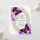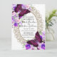 Estas hermosas tarjetas de boda blancas de encaje presentan mariposas y flores púrpuras y rosas crema. Perfectas para una boda rústica de campo o para una celebración de boda DIY. Muy elegantes.