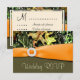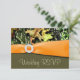 Tarjetas de confirmación de boda con camuflaje de caza: cada tarjeta de confirmación presenta una cinta naranja impresa alrededor con un adorno de hebilla redonda con diamante. Debajo de la cinta impresa, la mitad inferior presenta un estampado marrón-verde moteado en tonos terrosos. En la mitad superior de cada invitación se muestra un estampado de camuflaje de caza elegante con colores verde musgo, marrón, beige, gris y otros colores al aire libre. El estampado de camuflaje presenta ramitas, hojas, corteza y otros desechos. El diseño se envuelve alrededor de la parte posterior y presenta el mismo diseño con una caja de texto blanca cremosa y elegante que permite que las gráficas se asomen. El material de la tarjeta de confirmación se establece en lino para una mayor elegancia; sin embargo, puede cambiar el tipo de papel a básico, de fieltro o metálico debajo del botón naranja de personalización debajo de la demostración de la tarjeta de confirmación. Cada tarjeta de confirmación viene con un sobre blanco.