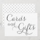 Hermoso letrero de tarjetas y regalos con un patrón de puntos y letra script caligráfica delicada negra. Esta tarjeta plana será perfecta para bodas y eventos similares. Disponible en otros colores.