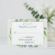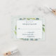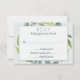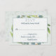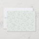 Tarjetas de respuesta de hojas de eucalipto para una boda. La tarjeta de 3.5 x 5 pulgadas es de color verde azulado pálido con un gran fondo de corona y apariencia en capas. Un panel blanco crema sostiene las plantillas de texto en azul oscuro con RSVP en la parte superior. Personalice con la fecha de solicitud de respuesta y su elección de cómo responder. Se puede agregar un sitio web de boda, o el texto tradicional "estará allí" "no asistirá". Incluya un espacio para el número de invitado si lo desea. La parte trasera de la tarjeta tiene un patrón ligero de hojas. Mejore a un papel especial para que coincida con las invitaciones como desee.