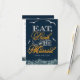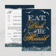 Tarjetas de confirmación de boda náuticas en azul marino y naranja - coinciden con las invitaciones y más que se encuentran a continuación en esta página. Complementa tu tema de boda náutica con estas invitaciones que presentan aves, olas en la parte inferior y la nueva frase popular, "Come, bebe y cásate". Este diseño presenta un fondo azul marino (marino) con cuatro aves blancas. La letra elegante es una combinación de colores naranja y blanco. Las olas en la parte inferior están sombreadas en un color azul muy claro. La parte trasera presenta el mismo fondo azul oscuro con un marco de ola ornamental blanco a juego para darle un toque de elegancia. Puedes actualizar el tipo de papel de la tarjeta a opciones más elegantes en la parte superior derecha. Cada confirmación viene con un sobre blanco ajustado. Ver la invitación de boda a continuación para obtener detalles del diseño.