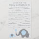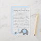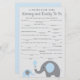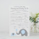 Utilice nuestras tarjetas de consejos para baby shower con tema de elefante azul y gris para dejar sus consejos y deseos de una manera divertida y única. La tarjeta tiene frases como "Asegúrate de tener siempre ___________ en el bolso de pañales" y para asegurarse de "_____________ al bebé todos los días".