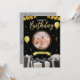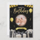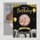 Portada de la tarjeta de cumpleaños de los niños: un alegre dinosaurio personalizado sostiene un quequito. Dentro: "¡Espero que tu día sea dino-mite! ¡Que tengas el mejor cumpleaños de la historia!"