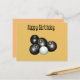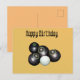 Representados en amarillo mandarín están cuatro boles de césped negros y jack con un feliz cumpleaños