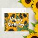 Nada es más alegre y soleado que esta linda tarjeta de cumpleaños de girasoles. La hermosa letra cursiva dice Feliz Cumpleaños sobre un campo de hermosos girasoles.