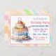 Invitaciones de cumpleaños para niñas, niños o adultos. Pastel de cumpleaños caprichoso con glaseado y velas moradas, rosadas, azules y amarillas.