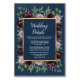 Las tarjetas de Boda de la Marina Malva Blue Gold Plum cuentan con vegetación (eucalipto) sobre un fondo acuático azul marino con elementos florales en tonos violeta, ciruela, malva, rosa polvoriento y burdeos profundos.