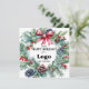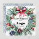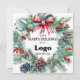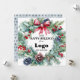 Tarjetas personalizadas de "Felices Fiestas" para clientes o empleados, personalizadas con el logotipo de su empresa, el año, una gran corona floral festiva, un lazo rojo elegante y un patrón de copos de nieve azules en la parte posterior. Suministros promocionales de la empresa para Navidad.