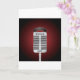Este diseño es un micrófono del canto. El micrófono está en un soporte listo para que alguien cante en él. Este luce increíble del diseño del micrófono del canto en tarjetas de esta felicitación
