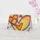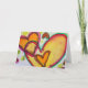 Los corazones de durazno y naranja se conectan como burbujas que soplan y flotan juntos. Un contorno verde traza cada corazón. Los puntos de color amarillo pálido son como confeti entre los corazones. La pintura de acuarela tiene una capa ligera de oro y rosa encima. Personaliza esta tarjeta con tu propio texto e imágenes utilizando la opción personalizar. Detalle de la pintura de la palabra inspiradora "Reír".