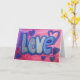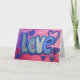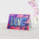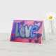 Pintura de la palabra "amor" en algodón azul dulce contra fondo de chicle rosa y púrpura. Los corazones morados y azules bailan alrededor de las letras. En la parte superior hay una capa clara de purpurina azul y plateado. Personalice esta tarjeta de bienvenida de arte de palabras de amor con su propio texto e imágenes usando el botón "Personalizar".