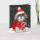 El perrito de ojos brillantes de Shih Tzu que lleva el suéter y el gorra rojos de Santa mientras que sostiene el bastón de caramelo contra los cielos nevosos hace esto una tarjeta de Navidad llamativa para sus amigos de Shih Tzu.