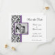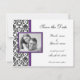 Tarjetas de damasco negro para guardar la fecha con un marco morado alrededor de tu foto. Tarjetas formales con sobres incluidos.