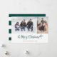 Tarjetas fotográficas verde personalizado Feliz Navidad con dos fotos con un título de caligrafía en la parte delantera y rayas verdes y blancas en la parte trasera. Personaliza fácilmente estas tarjetas de fotos de Navidad de caligrafía verde con tus imágenes, un nombre familiar y el año.