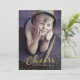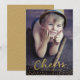Tarjetas de fotos de vacaciones con confeti y guión dorado Cheers